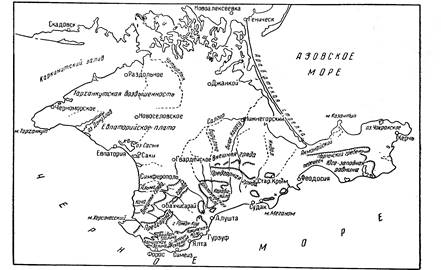 Крымский полуостров (рис.1) почти со всех сторон окружен морем с юга глубоководной частью Черного моря, с запада Евпаторийским и Каркинитским заливами, с востока Азовским морем. Вдоль северного и северо-восточного побережья Крыма протягивается Сиваш - залив Азовского моря, отличающийся очень изрезанной береговой линией и разделяющийся Чонгарским полуостровом на Западный и Восточный Сиваши. От Азовского моря Сиваш отчленен длинной косой - Арабатской стрелкой. С материком Крымский полуостров соединен лишь узким Перекопским перешейком. Восточная оконечность Крыма носит название Керченского полуострова, который отделен от Taманского полуострова Керченским проливом.