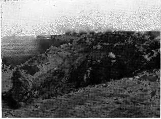 Берега Тарханкутской возвышенной равнины абразионного типа, высокие (30-50 м), обрывистые. Механическое и растворяющее действие воды обусловило большую расчлененность берегового обрыва, формирование пластовых ступеней с массой различного рода углублений, ниш, гротов и пещер. На Джангульском участке побережья, протягивающемся на 5 км к северу от мыса Kapa-Мурун, развиты оползни (рис.5,6). В основании высокого (до 60 м) берегового обрыва залегают сарматские глины, по которым сползают в море вышележащие известняки. Здесь широко развиты оползневые цирки, тepрасы, буrры, валы выпирания и глыбовые развалы.