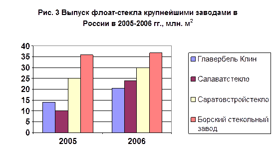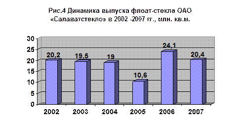 Некоторый спад темпов роста производства в 2005-2006 годах по сравнению с 2004 годом. Снижение производства в 2005-2006 гг. по сравнению с 2004 годом было вызвано модернизацией и плановой профилактикой на предприятии, а также опережающим ростом предложения стекла со стороны азиатских и европейских производителей. |