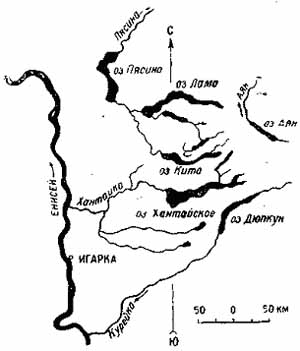 Прочие озера района. На северо-западе района, в низовьях Енисея, выделяется Хантайская группа озер (рис. 1)[19] ледникового происхождения.
