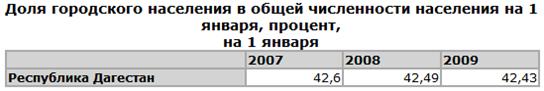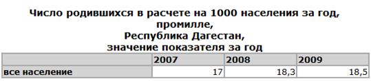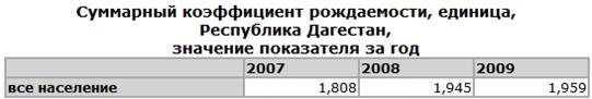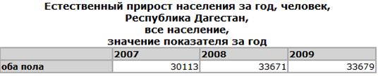 Рождаемость — 19,5 на тысячу населения (3 место в Российской Федерации, после Ингушетии и Чечни). Среднее число детей на одну женщину — 2,13. Фактически наблюдается другое: рождаемость растет — смертность сокращается. Рост населения приходится за счет естественного прироста. К примеру, за последние три года в Дагестане заметно выросла рождаемость детей и несколько снизилась смертность. На начало 2009 года численность постоянного населения составила 2713,4 тыс. человек, в том числе городского — 1151,5 тыс., сельского — 1561,9 тыс. За прошедший год численность населения республики возросла на 25,6 тыс. человек. В Дагестане преобладает сельское население, и темпы прироста населения в сельской местности выше, чем в городах. На начало 2009 года удельный вес городского населения составил 42,4 процента и сельского — 57,6 процента. Весь прирост населения республики, как и в предыдущие годы, обеспечивается исключительно за счет естественного прироста, перекрывающего отрицательное сальдо миграции.