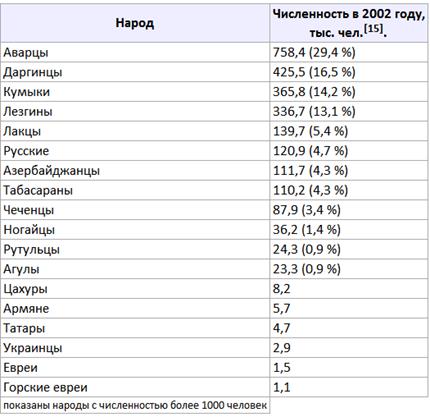 Население Дагестана насчитывало согласно официальным переписям населения: в 1897 г. — 571 тыс., в 1926 — 744.1, 1939 — 1023.3, в 1959 — 1062.5, в 1970 — 1428.5, в 1979 — 1627.8, в 1989 — 1802.2 тыс. человек. В годы Отечественной войны население сократилось, довоенная численность населения была превышена в 1959 г.