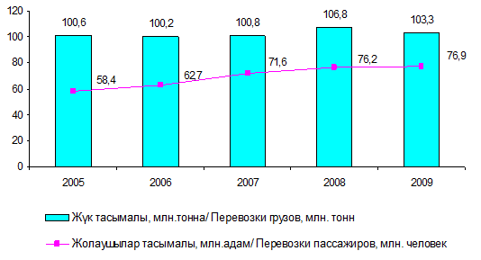 Перевозки пассажиров с учетом оценки объема перевозок предпринимателями (физическими лицами), занимающимися коммерческими перевозками за 2009 год увеличились на 0,9 % и составили 76,9 млн. человек. Объемы перевозок грузов и пассажиров за 2005—2009 годы приведены в следующей диаграмме: