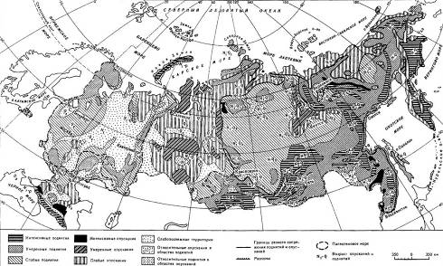 Внутренние части Евразиатской литосферной плиты относятся к областям слабых и очень слабых поднятий и преимущественно слабых и умеренных опусканий. Интенсивно опускались лишь Прикаспийская низменность и южная часть Скифской плиты. Большая часть территории Западной Сибири испытывала слабые опускания (до 100 м) и лишь на севере опускания были умеренными (до 300 м и более). Южные и западные окраины Западной Сибири и большая восточная часть Восточно-Европейской равнины представляли собой слабо подвижную равнину. Наибольшие амплитуды поднятий на Восточно-Европейской равнине характерны для Среднерусской, Приволжской и Бугульмино-Белебеевской возвышенностей (100-200 м). На Среднесибирском плоскогорье амплитуда поднятий была больше. Приенисейская часть плоскогорья поднята на 300-500 м, а плато Путорана даже на 500-1000 м и выше.