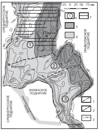 Рис. Схема инфраструктуры Окско-Донской депрессии. Условные обозначения: 1 – граница Окско-Донской впадины; 2 – границы крупных структурных элементов; 3 – изогипсы вершинной поверхности; 4 – структуры внутри впадины (цифры в кружках): 1 – северная часть, 2 – центральная часть, 3 – юго-восточная часть; 5 – области, испытавшие основную фазу погружения в среднем и позднем миоцене; 6 – области, испытавшие основную фазу погружения в плиоцене; 7 – области, испытавшие интенсивные погружения в четвертичном периоде