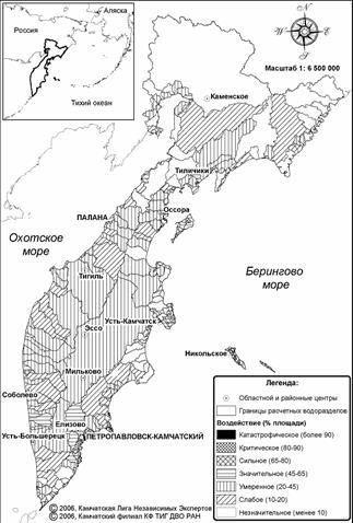 Рис.1 Антропогенные воздействия и угрозы природным системам рассчитанные для территорий речных бассейнов Камчатки