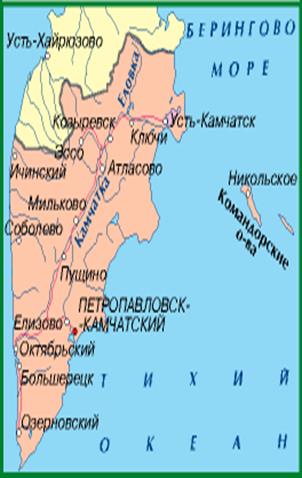 На западе полуостров омывается водами холодного Охотского моря, на востоке - Берингова моря и Тихого океана. Северная точка области расположена почти у Северного полярного круга (65ºс.ш.), южная – мыс Лопатка возвышается над Первым Курильским проливом (51ºс.ш). Камчатка, в основном, горная страна. Вдоль полуострова на многие сотни километров протянулись два основных хребта: Срединный, самый протяженный, и Восточный, между которыми разместилась Центрально-камчатская низменность с главной рекой полуострова - Камчаткой. Полуостров относится к зоне активной вулканической деятельности, на его территории имеется около 300 крупных и средних вулканов, 29 из них относятся к действующим вулканам. Здесь расположен самый высокий вулкан Евразии, один из высочайших действующих вулканов мира - Ключевская сопка (4750м). С деятельностью вулканов связано образование многих полезных ископаемых, а также гидротермальной активности: появление горячих источников, образование фумарол, гейзеров и других проявлений. Для побережья и юга полуострова характерен морской климат, для центральной и северной части - континентальный. Зима на полуострове отличается в разных его частях: многоснежная и мягкая на побережье, морозная в центральной и удаленной от побережья части, суровая и ветреная на севере. Снег ложится в конце сентября на севере, и в конце октября - на юге. Лето относительно прохладное на побережье, и довольно жаркое в центральной части.