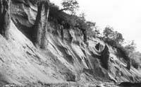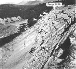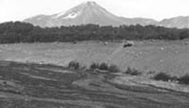 Мощные лахары наблюдались и во время исторических извержений. В 1938 г. такой лахар прошел по долине р.Сухая Халактырская. В верховьях долины он двигался единым потоком, а на абсолютной высоте 400 м разделился на две ветви (рис.11 ). В месте разветвления скорость лахара юго-западного рукава была так велика, что он смог преодолеть здесь уступ высотой более 15 м, уничтожив росший на холмистом моренном рельефе вековой березовый лес на протяжении 7 км [16,18]. Грязевые потоки прошли тогда дальше 30 км по долинам руч. Первый и р.Половинка (продолжение сухой реки) и достигли берега океана. Видимая мощность отложений лахара в долине р.Сухая Халактырская составляет сейчас 5-6 м. В 1926 г. водный поток, насыщенный черной грязью (рис.12 ), дошел по р.Сухая Елизовская до р.Авача и вызвал гибель рыбы [17]. Мощность его отложений составляет сейчас не менее 1 м в 25 км от кратера.