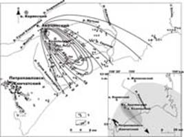 В отношении вулканической опасности очень удачно положение г.Петропавловск-Камчатский, который находится как раз на территории области Г (рис.14 ). Сюда за последние 10 тыс. лет не доходили пирокластические потоки и связанные с ними "палящие тучи", возвышенность, на которой расположен город, обтекалась лахарами. Опасность могут представлять только пеплопады разной интенсивности. Так, при мощности выпавшей тефры 10-20 см будут уничтожены травянистый покров и посевы, 5 см пепла затруднят движение транспорта и могут вызвать повреждение коммуникаций. Механизмы и приборы очень чувствительны к абразивному и коррозионному воздействию пепла. Максимально опасны пепловые тучи для летательных аппаратов [7,8], обслуживающих внутренние и международные авиалинии, учитывая положение Елизовского аэропорта. При пеплопадах происходит резкое ухудшение видимости и может наступить полная темнота. Линии электропередач и связи выходят из строя при прохождении сильно ионизированного пеплово-газового облака. Все это вызывает психологические стрессы и панику среди людей даже в тех случаях, когда их жизни нет прямой угрозы. Поэтому население должно быть обязательно извещено об опасности от пеплопадов и элементарных правилах поведения в этом случае.