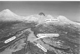 Зона опасности от лавовых и пирокластических потоков, пирокластических волн и раскаленных лавин в южном, западном и восточном секторах ограничивается склонами Молодого конуса и его ближайшего подножия (рис.14 ). Границы зоны, захватывающей верховья рек Сухая Елизовская, Сухая Халактырская и Желтуха, проходят на расстоянии 6 км от кратера. На севере и северо-востоке она может спускаться на внешние склоны соммы и в истоки рр. Седловинка и Мутная в радиусе до 2 км от кратера.
