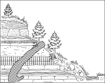 Обнажение горных пород – это выход пород на земную поверхность в оврагах, долинах рек, карьерах, шахтных выработках, на склонах гор. Породы в обнажении обычно скрыты тонким слоем осыпи, поэтому прежде всего его очищают от лишнего материала. При изучении обнажения обращают внимание на то, какими породами оно сложено, каковы состав и мощность этих пород, порядок их залегания (рис. 17). Обнажение тщательно описывают, зарисовывают или фотографируют. Из каждого пласта берут пробы для дальнейшего изучения в лаборатории. Лабораторный анализ проб необходим для того, чтобы определить химический состав пород, их происхождение и возраст.