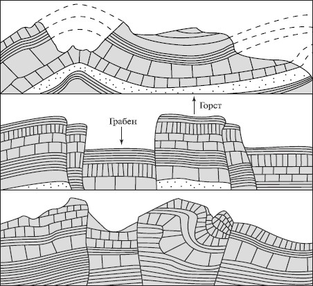 Разрывные движения. Если горные породы недостаточно прочны, чтобы выдержать действие внутренних сил, в земной коре образуются трещины – разломы и происходит вертикальное смещение горных пород. Опустившиеся участки называют грабенами, а поднявшиеся – горстами (рис. 23). Чередование горстов и грабенов создает глыбовые (возрожденные) горы. Примерами таких гор служат: Алтай, Саянские, Верхоянский хребет, Аппалачи в Северной Америке и многие другие. Возрожденные горы отличаются от складчатых как по внутреннему строению, так и по внешнему виду – морфологии. Склоны этих гор часто отвесные, долины, как и водоразделы, широкие, плоские. Пласты горных пород всегда смещены относительно друг друга.