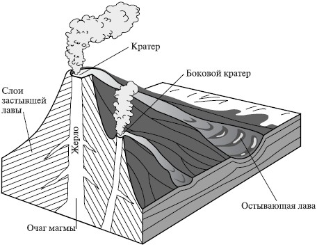 Более широко распространены вулканы с вязкой лавой, которая, остывая, образует вулканический конус. Конус всегда имеет слоистое строение, которое свидетельствует о том, что излияния происходили многократно, а вулкан вырастал постепенно, от извержения к извержению.