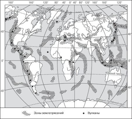 Большая часть действующих вулканов расположена вокруг Тихого океана, образуя Тихоокеанское «огненное кольцо», и в Средиземноморско-Индонезийском поясе. Только на Камчатке известно 28 действующих вулканов, а всего их более 600. Распространены действующие вулканы закономерно – все они приурочены к подвижным зонам земной коры (рис. 25).