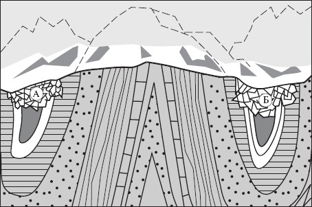 Как только суша поднялась над океаном, на поверхности ее начали действовать внешние процессы. Горные породы разрушались, продукты разрушения сносились в океан и накапливались по его окраинам в виде осадочных горных пород. Толща осадков достигала нескольких километров, и под ее давлением океанское дно начинало прогибаться. Такие гигантские прогибы земной коры под океанами называют геосинклиналями. Образование геосинклиналей в истории Земли идет непрерывно с древнейших времен по настоящее время. В жизни геосинклиналей различают несколько стадий: