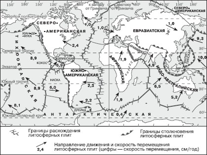 Литосферные плиты и их движение. Учение о геосинклиналях и платформах получило в науке название «фиксизм», поскольку согласно этой теории крупные блоки коры зафиксированы на одном месте. Во второй половине XX в. многие ученые поддержали теорию мобилизма, в основе которой лежит представление о горизонтальных движениях литосферы. Согласно этой те ории вся литосфера глубинными разломами, достигающими верхней мантии, разбита на гигантские блоки – литосферные плиты. Границы между плитами могут проходить как по суше, так и по дну океанов. В океанах этими границами обычно служат срединные океанические хребты. В этих областях зафиксировано большое количество разломов – рифтов, по которым вещество верхней мантии изливается на дно океана, растекаясь по нему. В тех областях, где проходят границы между плитами, нередко активизируются процессы горообразования – в Гималаях, Андах, Кордильерах, Альпах и т. д. Основание плит находится в астеносфере, и по ее пластическому субстрату литосферные плиты, подобно гигантским айсбергам, медленно перемещаются в разных направлениях (рис. 29). Перемещение плит зафиксировано точнейшими измерениями из космоса. Так, африканский и аравийский берега Красного моря медленно удаляются друг от друга, что позволило некоторым ученым назвать это море «зародышем» будущего океана. Космические снимки позволяют проследить и направление глубинных разломов земной коры.