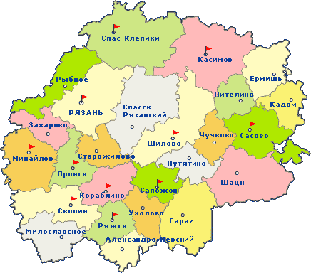 В состав области входит 25 районов, 12 городов (4 города областного значения: Рязань, Касимов, Скопин, Сасово) и 27 поселков. Административные районы Рязанской области: Ермишинский, Захаровский, Кадомский, Касимовский, Клепиковский, Кораблинский, Милославский, Михайловский, Новодеревенский, Пителенский, Пронский, Путятинский, Рыбновский, Ряжский, Рязанский, Сапожковский, Сараевский, Сасовский, Скопинский, Спасский, Старожиловский, Ухоловский, Чучковский, Шацкий, Шиловский. (рис. 2)