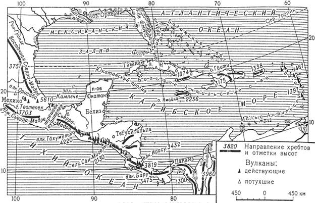 Геологическое строение и рельеф. Тектонически Центральная Америка частично представляет собой продолжение Кордильер Мексики, а частично принадлежит к особой, Антильско-Карибской области Кордильерского пояса (рис. 1).