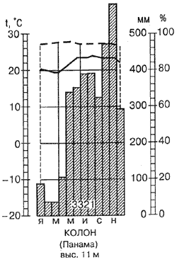 Рис. 2. Годовой ход температур, осадков и относительной влажности в Панаме