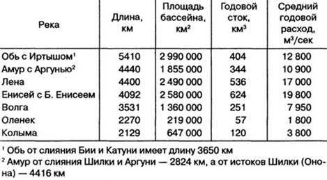 Наиболее длинные и многоводные реки впадают в Северный Ледовитый океан: Северная Двина, Печора, Обь с Иртышом, Енисей — самая полноводная река, Лена — самая длинная река, Индигирка, Колыма и др. К бассейну Тихого океана относятся Амур, Анадырь, Пенжина и др. В моря Атлантического океана несут свои воды такие крупные реки, как Дон, Кубань, Нева.