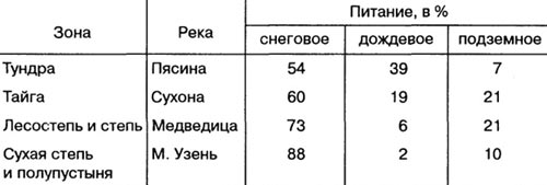 На большей части территории России в той или иной мере преобладает снеговое питание рек, что чрезвычайно характерно для районов с достаточно устойчивой снежной зимой, которая наблюдается на значительной части страны. Там, где снега выпадает мало (Забайкалье, Приамурье), либо зимы мягкие и осадки часто выпадают в виде дождей (Калининградская область), находятся реки с преобладанием дождевого питания. В горных районах со значительным современным оледенением (Кавказ, Алтай) возрастает роль ледникового питания. Рек с преобладанием грунтового питания в России очень мало. Они встречаются на Камчатке в районах распространения вулканических пород, в предгорьях Кавказа. Примером таких рек является река Авача на Камчатке, грунтовое питание которой достигает 60%.