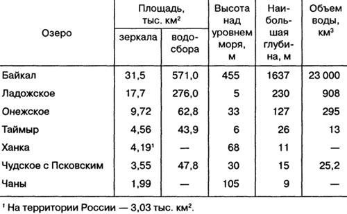 На территории России находится свыше 2 млн озер. В основном это небольшие озера с площадью водной поверхности менее 1 км2 . Крупных озер мало. Два озера России — Байкал и Ладожское — входят в число 18 крупнейших озер мира (площадь каждого из них более 10 000 км2 ), близко к ним Онежское озеро (таблица 4).