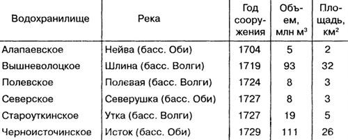 Первым в России было построено Алапаевское водохранилище (1704 г.) на среднем Урале для обеспечения водой и механической энергией завода. Вторым было водохранилище транспортного назначения — Вышневолоцкое (1719 г.).