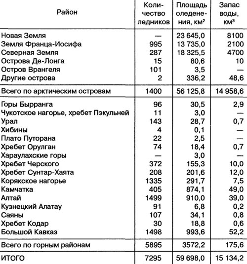 Таблица 6. Современное оледенение России (по Л.Д. Долгушину, Г.Б. Осиповой, 1989)
