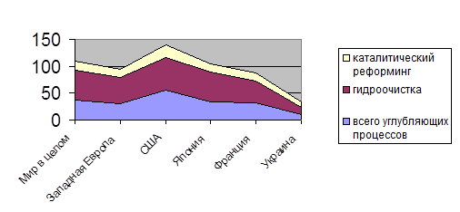 Рисунок №4 Мощность углублубляющих процессов (% от атмосферной перегонки) в мире и отдельных странах. [6,19]