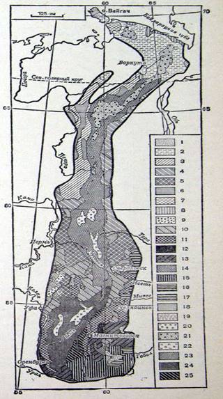 Рис. 2- Почвы Урала: 1 - тундровые арктические; 2 - тундровые глеевые; 3 - глеево-подзолистые (поверхностно-оглеенные) и подзолистые иллювиально-гумусовые; 4 - подзолистые и подзолы; 5 - дерново-подзолистые; 6 - подзолисто-болотные; 7 - торфяно-болотные (верховых болот); 8 - перегнойно-торфяно-болотные (низинных и переходных болот); 9 - дерново-карбонатные; 10 - серые лесные и - черноземы выщелоченные и оподзоленные; 12 - черноземы типичные (тучные среднемощные); 13 - черноземы обыкновенные; 14 - черноземы обыкновенные солонцеватые; 15 - черноземы южные; 16 - черноземы южные солонцеватые, 17 - лугово-черноземные (большей частью солонцеватые); 18 - темно-каштановые; 19 - солонцы 20 - аллювиальные (пойменные), 21 - горно-тундровые; 22 - горно-луговые; 23 - горно-таежные подзолистые и кислые неоподзоленные; 24 - горно-лесные, серые; 25 - горные черноземы.
