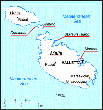 Республика Мальта — государство в Южной Европе, на Мальтийском архипелаге, в центральной части Средиземного моря. В XIII веке до нашей эры Мальта была колонизирована финикийцами, затем греками. В VI веке до нашей эры — XIII веке нашей эры ею попеременно владели карфагеняне, римляне, Византия, арабы, норманны (присоединившие ее к Сицилии), испанцы. В 1530 году император Карл V предоставил Мальту духовно–рыцарскому ордену иоаннитов, получившему с тех пор название Мальтийского ордена. В 1798 году Мальта захвачена Францией, а в 1800 — Великобританией, превратившей ее в свою колонию и военно–морскую базу.