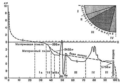 Наглядное представление о характере распределения высот суши и глубин океанского дна дает гипсометрическая кривая (рис.1). Она отражает соотношение площадей твердой оболочки Земли с различной высотой - на суше и с различной глубиной - в море. С помощью кривой вычислены средние значения уровня земной поверхности с учетом уровня земной поверхности (245 м), твердой оболочки (-2440 м), суши (840 м) и средней глубины моря (-3880 м). Если не принимать во внимание горные области и глубоководные впадины, занимающие относительно небольшую площадь, то на гипсометрической кривой можно отчетливо выделить два преобладающих уровня: уровень континентальной платформы высотой примерно 1000 м и уровень океанического ложа с отметками от -2000 до -6000 м. Соединяющая их переходная зона представляет собой относительно резкий уступ и называется континентальным склоном. Естественным продолжением континента является его внешняя, затопленная морем часть, - континентальный шельф. Таким образом, естественной границей, разделяющей океан и континенты, является не видимая береговая линия, а внешняя граница склона.