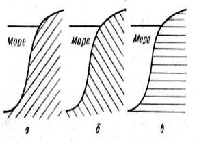 Падение пластов: а — в сторону моря: б — в сторону материка; в — горизонтальное залегание.