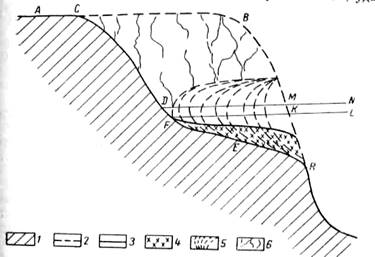 собственного веса, работы подземных вод и по другим причинам постепенно обрушиваются и превращаются в глыбы и обломки, которые подхватываются волнами и течением и продолжают дальнейшее разрушение берега. Линия ABMK — первоначальный склон берега; линия ACDF —новый склон берега; FER — волноприбойная терраса. Эта терраса бывает, сложена коренными породами, но чаще на ней залегает обломочный материал, получающийся от разрушения берега, в виде глыб, гравия, галек, щебня, песка и ила.