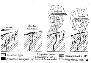 Газовый тип извержений, при котором выбрасываются в воздух лишь обломки уже твердых, более древних пород, либо обусловлен магматическими газами, либо связан с перегретыми грунтовыми водами. В последнем случае извержения называются фреатическими (рис. 1.6) [11].