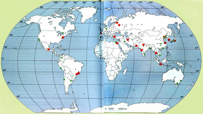 Очень быстрые темпы характерны для развития больших городов, т.е. городов с населением более 100 тыс. человек. С 1800 по 1980 г. количество больших городов увеличилось примерно в 30 раз, численность населения в них – в 51, а доля населения, проживающего в таких городах, во всем населении – в 12 раз. Особенно быстрый рост больших городов происходил в XX веке. Еще более быстрыми темпами роста отмечаются крупнейшие города – миллионеры. В 1800 г. в мире был только один город с населением более 1 млн. человек (0,1% населения Земли), в 1900 г. их было уже 10, а к началу 90-х г.г. – около 320. Ожидают, что к 2000 г. в мире будет около 430 городов – миллионеров, и они сосредоточат более 20% населения Земли.