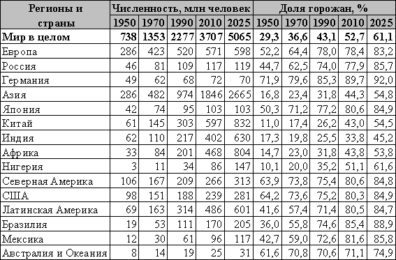 Важная особенность мировой урбанизации во второй половине ХХ в. – выход на авансцену развивающихся стран. В 1990 г. в них проживало уже 61,4% всех горожан мира (в 1950-м только 38,7%), а к 2025 г., по прогнозам демографов ООН, эта цифра возрастёт почти до 80%.