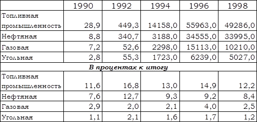 До 1988 года динамическое развитие отраслей топливной промышленности обеспечивалось в основном за счёт направления на эти цели значительных объёмов государственных централизованных капитальных вложений при среднегодовом их приросте до 10%. Начиная с 1989года в связи с переходом на новые условия хозяйствования и дальнейшим переводом отраслей на самоокупаемость и самофинансирование, объём государственных инвестиций резко сократился. В 1998 году доля этого источника в общем объёме капитальных вложений по комплексу составила 0,6%, а без учёта господдержки угольной промышленности – 0,1%.