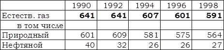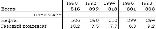 Происходит интенсивное снижение добычи нефти. С 1988 по 1993г. годовая добыча уменьшилась более чем на 210 млн. т. Это обусловлено целым комплексом факторов: высокопродуктивные запасы крупных месторождений в значительной мере выработаны разработка многих нефтяных скважин переведена с фонтанного на худший механизированный способ добычи. Начался массовый ввод в разработку мелких, низкопродуктивных месторождений, потребности отрасли в материальных и финансовых ресурсах не удовлетворяются. Негативное влияние оказало и ослабление экономических связей с Азербайджаном и Украиной, на территории которых находилось большинство заводов бывшего СССР по производству нефтепромыслового оборудования и труб.