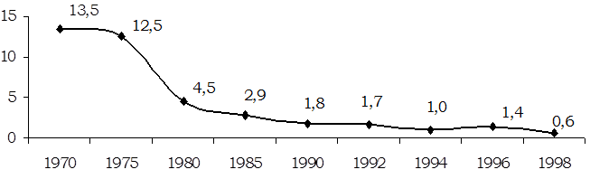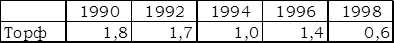 Из графика мы видим, что наибольшее производство топливного торфа (условной влажности) было в 1970 году и составило 13,5 млн.т. за пять лет производство снизилось на 1 млн. т. (7%). Кризис производства топливного торфа начался в период с 1975 года по 1980 год за рассмотренную пятилетку производство упало на 66,7% по сравнению с показателем 1970 года. В среднем с 1985 года по 1998 год снижение производства составило 22,5%. Но в 1996 году произошёл рост производства топливного торфа на 28% по сравнению с предыдущим годом. Затем снова объявился привычный для промышленности спад производства, который составил 57% от 1996 года.
