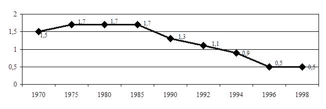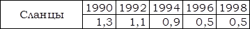 Данный график показывает темпы роста и снижения добычи сланцев в России. График показывает, что в период с 1975 по 1985 год добыча была сомой высокой в рассматриваемый период и составила 1,7 млн.т., затем наблюдается резкое снижение добычи на 23,5% (0,4 млн.т.). В дальнейшие годы снижение не уменьшилось, в 1992 году снижение составило 15,4%, 1994 г. – 18,2%, 1996 г. – 44,5%. В целом снижение с пика добычи (1975-1985) по 1998 год составило 70,6% (1,2 млн.т).