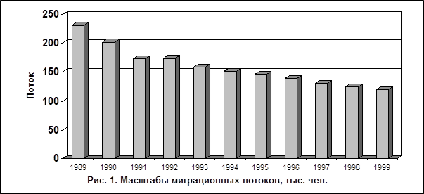 1. Масштабы миграционных процессов сокращаются. Если в 1970 г. в Ставропольском крае было зарегистрировано 304,6 тыс. мигрантов и на протяжении семидесятых годов наблюдался стабильный рост их количества (в 1975 г. – 341,5 тыс.), то уже в начале восьмидесятых отмечено некоторое сокращение миграционного потока: в 1980 г. в миграции на Ставрополье было задействовано всего 293 тыс. человек, а наиболее интенсивно снижение количества мигрантов отмечено с 1989 г., времени проявления первых симптомов обострения социально-экономической ситуации в стране (диагр. 1). В 1989 г. на Ставрополье было зарегистрировано 230,6 тыс. мигрантов. За 1991‑93 гг. сокращение составило 30 %, а общее количество мигрантов сократилось до 157,7 тыс. человек. В последующие годы их число постоянно сокращалось, достигнув минимума в 1998 г. – 123,8 тыс. человек, т.е. сократилось в 1,86 раза по сравнению с 1989 г. (табл. 1). Таким образом, сокращение масштабов миграции на Ставрополье проходит в унисон с общероссийскими тенденциями.