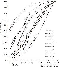 Для достоверной диагностики генетических типов пирокластики необходимо воспользоваться лабораторными методами изучения отложений, и, в первую очередь, рассмотреть гранулометрический состав этих образований и их заполнителей. Известно, что гранулометрический состав является наиболее информативной количественной характеристикой пирокластики, а в некоторых случаях - единственной, с помощью которой можно различать генетические типы пирокластических отложений. Содержание обломков, а также их максимальный размер в породах каждого из генетических типов пирокластики своеобразно и поэтому позволяет, например, различать разновидности типов пирокластических потоков (пеплово-глыбовых и "ювенильных") и пирокластических волн (приземных и волн пепловых облаков) (см. табл.1). Каждый из генетических типов пирокластики обладает определенным распределением фракций, и, следовательно, определенной формой и местоположением на графике кумулятивных кривых гранулометрического состава, а также и гранулометрическими статистическими коэффициентами (медианой, средним размером частиц и т.д.), отличающими один тип от других. Своего рода эталонным в этом отношении может служить рис.5, на котором показаны обобщенные кумулятивные кривые гранулометрического состава заполнителей пирокластики вулкана Безымянный извержений 1984-1989 гг. и 1956 г.