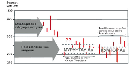 A. Yakubchuk et al. [17] полагают, что герцинский Тянь-Шаньский ороген формировался в ходе позднепалеозойской коллизии континентов Каракум-Таримского и Палео-Казахстанского. Западная часть Тянь-Шаня в Казахстане и Узбекистане образована: 1 – северотянь-шаньской деформированной окраиной Палео-Казахстанского континента; 2 – среднетянь-шаньской позднепалеозойской вулкано-плутонической дугой; 3 – южнотянь-шаньским интенсивно деформированным складчатым и надвиговым поясом на месте окончательного закрытия Палео-Туркестанского океана. На рис. 2 пунктирными линиями выделен временной интервал становления (в пределах погрешности) двух главных месторождений золота: Мурунтау Кызылкумского сегмента и Кумтор на востоке зоны сдвига Талас-Фергана.