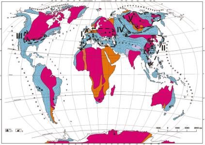 1. Историко-минерагенические провинции (эндогенный рудогенез) Для позднегерцинского этапы в пределах континентов Земли выделены историко-минерагенические провинции (ИМП, рис. 1): I. Западноевропейская–Североафриканская. II. Уральско-Казахстанско-Среднеазиатская. III. Южносибирская-Центральномонгольская. IV. Восточно-Австралийская. V. Перилаврентийская.