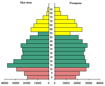 Трудоспособное население республики составляет 424,1 тыс. чел. в т.ч. городское население – 279,5 тыс. чел., сельское население – 144,6 тыс.чел., молодежь в возрасте в возрасте 16-29 лет - 170,4 тыс.чел. Из 424,1 тыс. чел. в трудоспособном возрасте в экономике занято около 282,2 тыс. чел. или 66,5%. Демографическая нагрузка, т.е. число лиц старше и младше трудоспособного возраста в расчете на 1 тыс. граждан трудоспособного возраста в 2005 году составила достаточно значительную величину- 656 чел. Это составляет 113 и 105% от средних показателей по РФ и ЮФО. Показатели демографической нагрузки в Кабардино-Балкарской и Карачаево-Черкесской республиках ниже и составляют 88% и 95% от уровня Северной Осетии-Алании.