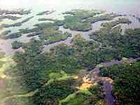 Широкая полоса «игапо» и «варзеа» резко выделяется, особенно в период засухи, среди безлесных участков. Берега же низменности не только вдоль океана, но и в глубь страны, вдоль русла нижнего течения реки, заросли манграми, еще более подчеркивающими сходство Амазонки — этого «средиземного моря» Бразилии — с настоящим морем.