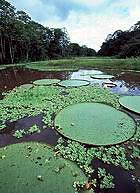 ширины, Леса варзеи — этой «прихожей» амазонских дебрей — изучены довольно хорошо вследствие их доступности. Они значительно выше и гуще, чем игапо, и наиболее богаты по видовому составу. Воды паводков разносят семена самых различных растений, осаждающиеся при спаде в плодородную аллювиальную почву. Богат и разнообразен и растительный мир Амазонии. Здесь и деревья, славящиеся своими плодами - папайя, разнообразнейшие пальмы, и деревья, ценимые Рис.3. Виктория Регии.