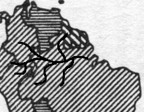красные тона латерит ной толщи. На кристаллических «крыльях» нагорий долины рек более мелки, но зато продольный профиль очень изломан и русла изобилуют порогами и быстринами. Лишь затопленные широкие эстуарные низовья, как бы «окунувшиеся» в Амазонку или в океан (сама Амазонка и Токантинс), доступны для судоходства. Естественно, что и разливы рек не столь широки, не переобременены они мельчайшей мутью и несут свои воды по кристаллическому или песчаному ложу. В третичных породах глубины рек необычайно велики, что также указывает на продолжающееся погружение: притоки Амазонки имеют 20—25 м глубины, сама она у Обидуса (выше устья Тапажоса) достигает 90 м, и даже маленькие речушки поймы — «игарапес» очень глубоки. Эти глубокие реки с прозрачной водой, темноту которой усиливают разлагающиеся растения, получили название «черные реки» (риос негрос).