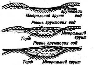 Озерні болота утворюються внаслідок заростання озера болотною рослинністю з одночасним накопиченням на дні рослинних рештків. Процес заростання розпочинається від берегів (рис. 2). До глибини 1 м переважає осока, глибше (1–2 м) – рогоза та очерет, на глибинах до 4–5 м – водяні лілії. В осінній період внаслідок відмирання рослин на дні утворюються рослинний мул та торф, який за складом відповідає названим вище рослинам. Утворення шару торфу сприяє обмілінню озера та, відповідно, розширенню ділянки розростання тих або інших рослин, тобто просуванню зони заростання до середини озера. Коли зони з'єднуються, озеро перетворюється на болото.